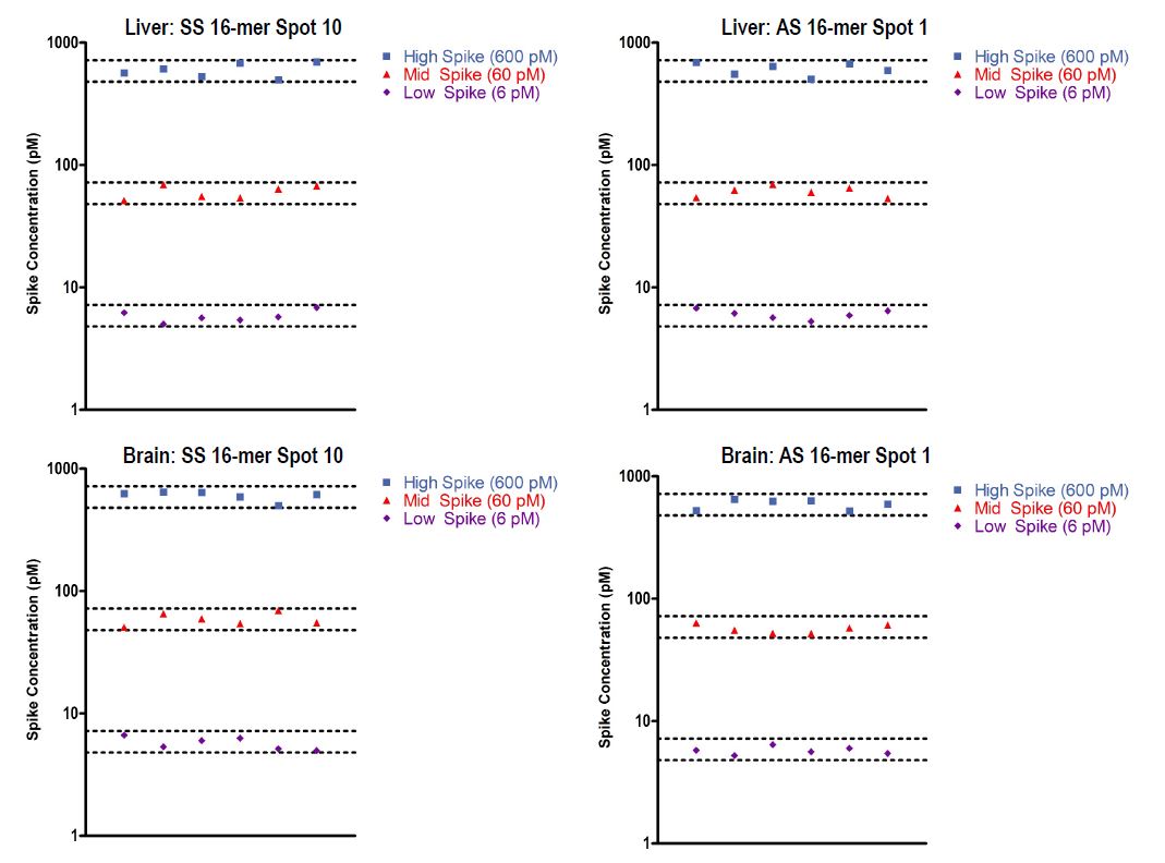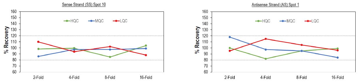 Figure 7. siRNA calibrator was spiked into mouse plasma at three concentrations. An SS 16-mer and AS 16-mer probe mix was used for multiplex detection of SS and AS. The percent recovery fell within acceptable guidelines of 100 ± 20%.